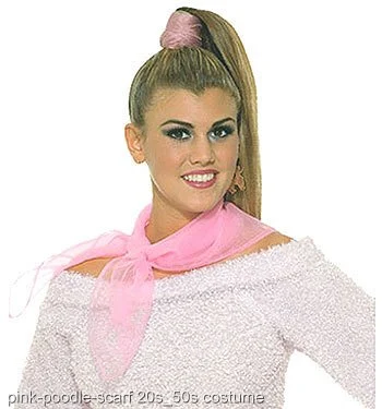 Pink ScarfWhether your a 50s waitress, Sandy from Grease or attending the sock hop in a classic poodle skirt, this black scarf is a swell choice! Look hip this Halloween with this pink, nylon scarf that features a poodle applique on the end. The applique is black and pink and has a white bead for an eye. Great for tying around the neck or in the hair!