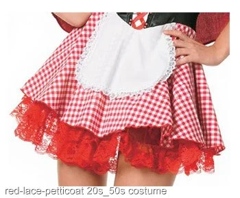 Red Lace Crinoline PetticoatAdd extra sexiness to your costume with this red lace petticoat. The red interior lining has a nylon top and three inches of lace trim at the bottom. An elastic waistband makes for a comfortable wear. This red petticoat is a great accessory for any sexy costume.