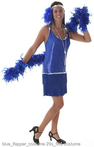 Sequin and fringe dressSilver sequin headband with feather tuftGet into the foot loose and fancy free mentality of the flapper era by putting on this royal blue flapper costume. The dress has two rows of hanging fringe, which allows for easy, open movement. A sequin head piece with feathers is also included, creating the finishing touch on an attire perfect for any costume event. Add the finishing touch with a royal blue feather boa.